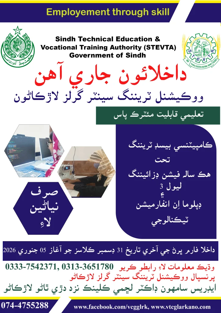 Vocational Training Centre Girls Larkano aims to provide all trainees with a broad and balanced vocational curriculum developed by NAVTTC, offering rewarding and practical learning experiences that prepare them for successful professional, social, and cultural life.