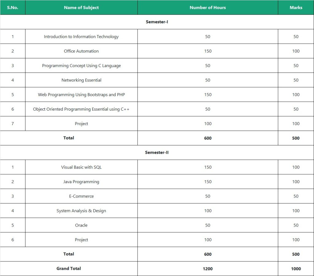 The course aims on producing the trained workforce in the field of Information Technology to fulfill employment requirement of I.T. industry not only in the country but also abroad. The curriculum is divided into two academic semesters. The curriculum of Semester-I is designed to train the students to work as database developer and manage the offices. The curriculum of semester-II is designed to train the students in the field of E-commerce and interactive web development.